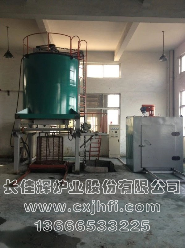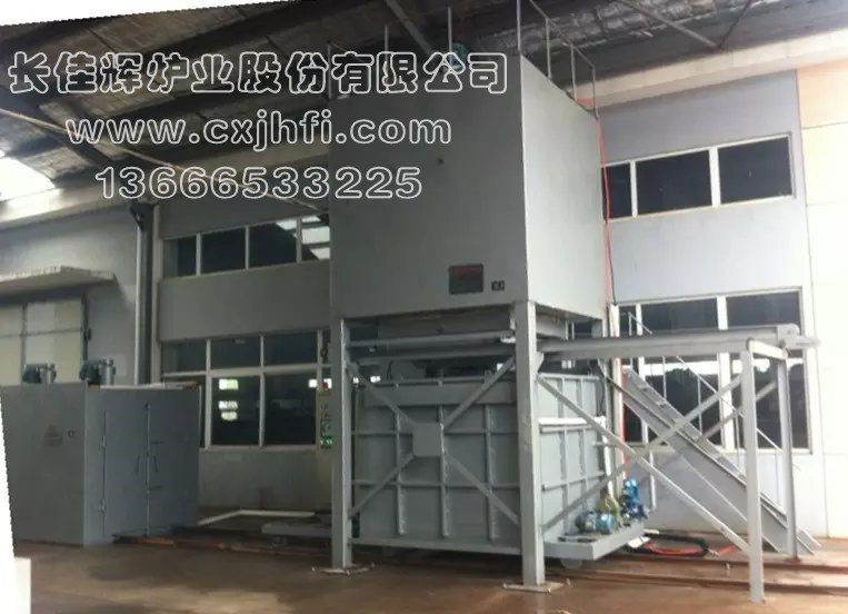 立式鋁合金固溶(淬火)爐 此設備可根據用戶要求進行定制、定做,服務熱線:13666533225 我公司生產的鋁合金固溶(淬火)爐有電加熱和燃氣加熱二種加熱方式,主要適用于鋁材焊接件、鋁鑄件及各種鋁合金產品進行淬火、固溶處理,工件的落水時間≤15秒。 操作流程:人工上料(推至預備位置)→爐蓋開啟→料勾下降→人工掛鉤→料框上升至加熱區(qū)→爐蓋關閉→根據產品工藝要求升溫、保溫→移動水池就位→爐蓋開啟→料框下降至移動水池內進行固溶→料框上升→移動水池退回→料框下降至平臺→(脫鉤)人工拉出→(整形處理后)推至時效爐進行時效處理。